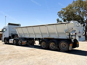 This 2015 Daf XF105 510 6x4 Prime Mover with 2016 AMS Live Bottom Tri-Axle Trailer is currently listed for sale in a live online auction. The auction closes at 8:00pm AET this Thursday, 15th of January 2026 unless extended by late bids.