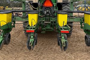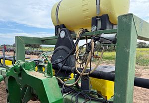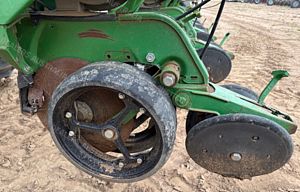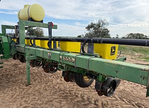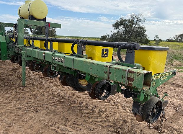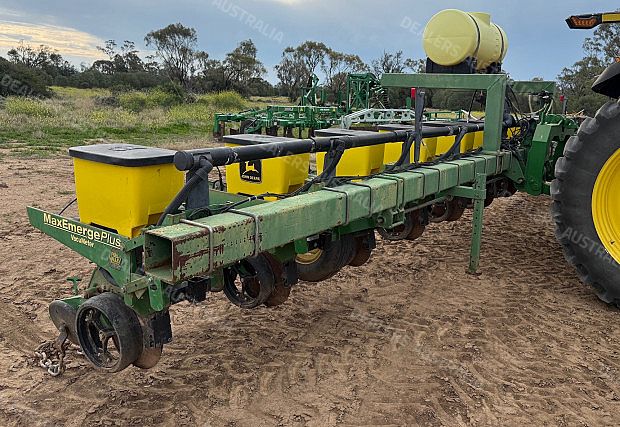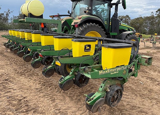 John Deere 1700 Maxemerge Plus Planter, 10 metre toolbar, 3 point linkage attachment, 10 x JD double disc planter units, vacuum metering, ground drive, been used for 12m double skip and 8 row 1m, John Deere 350 computertrak monitor, cotton plates, upgraded E-set meters, upgraded spoked gauge wheels, 300 L liquid tank set up for insecticide w/12 V pump, Boss covering chains, numerous spares, field ready, good condition, near Narrabri NSW, includes GST
