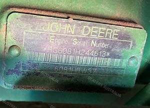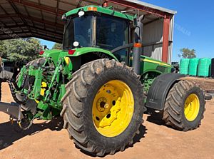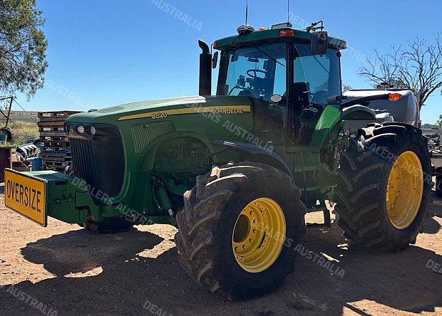 John Deere 8520 Tractor, 2004 model, 305 horsepower, 9520 hours, 16 speed powershift transmission, ILS front suspension, 3 metre wheel centres, 4 remotes, 3 point linkage w/quickhitch, 1000rpm PTO, 22 front weights, rear 620/70R42 tyres 80% rubber, front 600/65R28 tyres 60% rubber, rear dual rims (no rubber), steering valve, GPS gear not included, well maintained, service history available, good condition, near Clermont QLD, includes GST