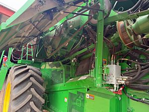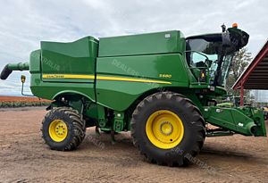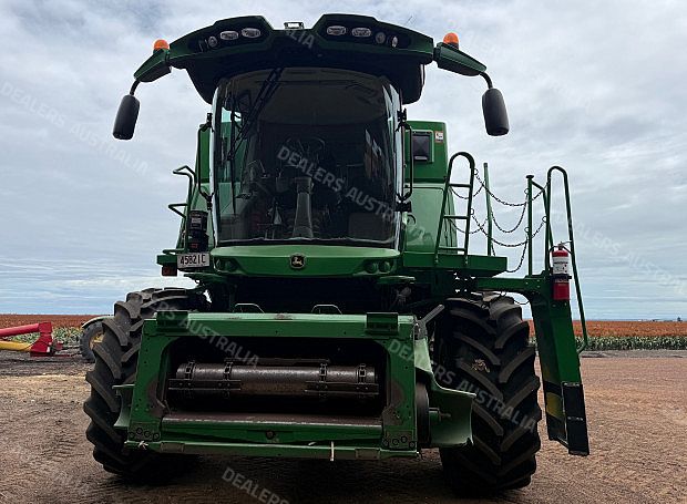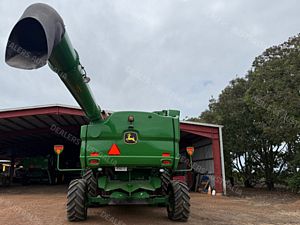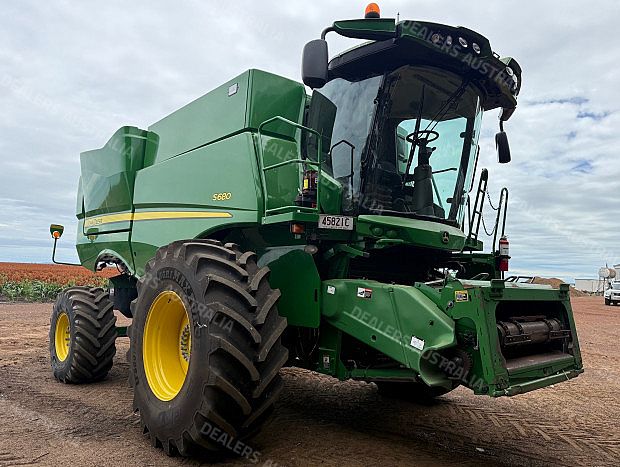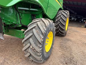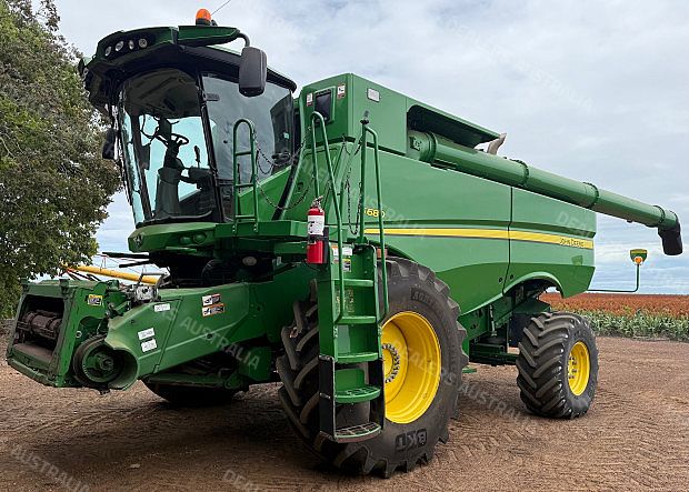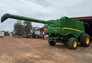 John Deere S680 Combine Harvester, 2015 model, 2005 engine hours, 1555 rotor hours, converted from track machine to wheel 300hrs ago (new final drives and wheel equipment), IF800/70R38 drive tyres (near new), VF620/70R26 steer tyres, 900 mm auger extension, 5 speed feeder house, Darling Downs farm use only, John Deere 2630 screen, no GPS receiver, always stored in shed, one owner, available for extra - Midwest 36 foot front, good condition, near Dalby QLD, includes GST