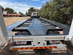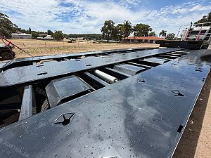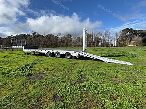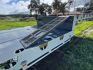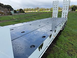 The all New 4 meter FreightWest Next Generation Heavy Duty Triaxle Drop deck Widener trailer. Widens to 4m. These trailers have the highest quality finishes with all the extras such as bifold ramps, sliding top deck ramps, with cordless remote, 9 tonne electric recovery winch,3 way container pins with pedestals, multiple tie down points, road train bracket, 19.5 inch polished Alloy wheels, K hitch axles on KT250 airbag suspension with dump valve, WABCO EBS braking system, 4x tool boxes with stainless doors and water tank. Must see these trailers to
