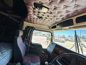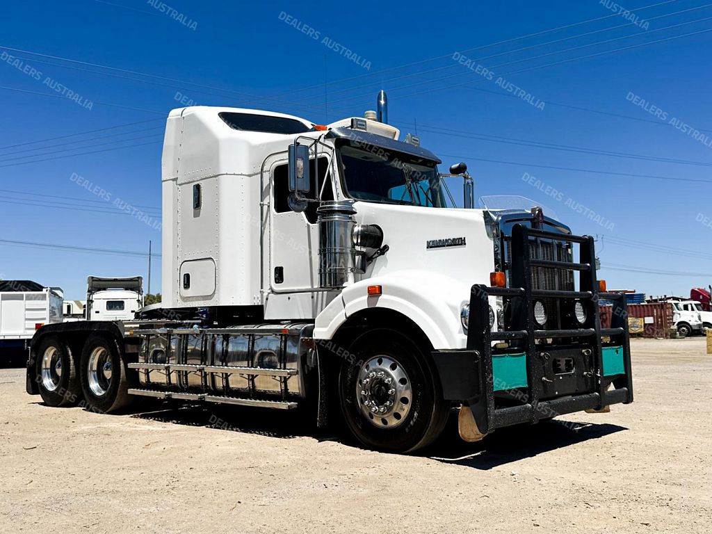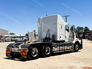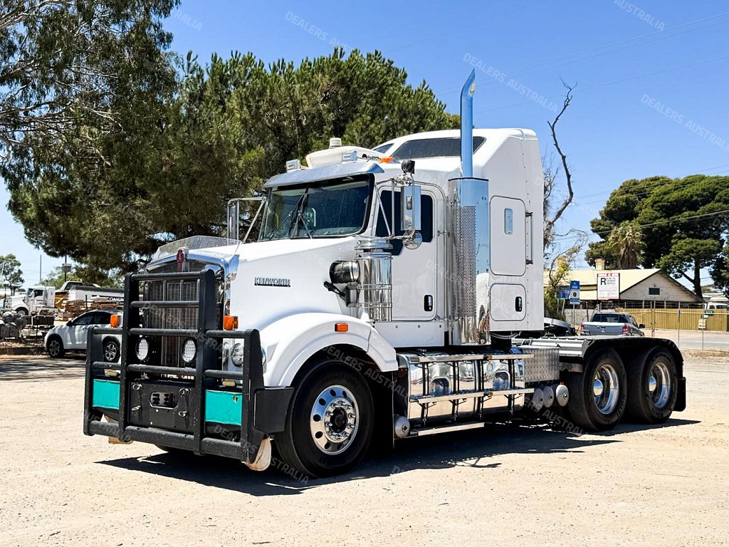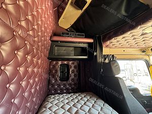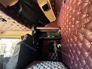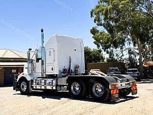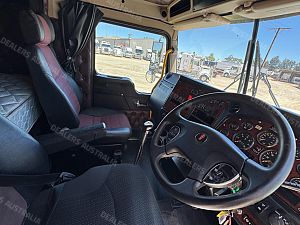 2014 Kenworth T409 SAR 6x4 Prime Mover, Cummins ISX E5 Engine @ 500Hp, 18 Speed Road Ranger Transmission, Meritor RT46-160 Rear Axles on Kenworth 8 Bag Air Bag Suspension, Bull Bar with Tow Pin and LED Spot Lights, 10 Stud Wheels, Plastic Bug Off, Stainless Steel Sun Visor, Square Tanks, Red Dot, Integrated Sleeper Bunk, Single Exhaust, Chassis Deck Plate, Fixed QRTT, Rubber Pul, Over Guards, Yard Dolly Pull to Rear of Chassis, Battery Isolator, ISRI Air Ride Drivers Seat, Maroon Diamond Stud Trim, Wood Grain Dash, Turbo Timer, IcePack 2000,