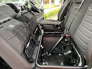 Bench seat with two occupant capacity, under seat storage and fold down table