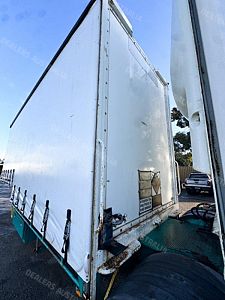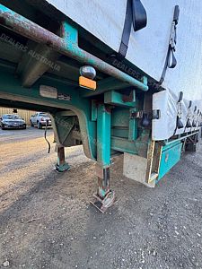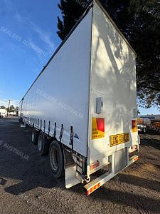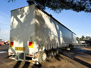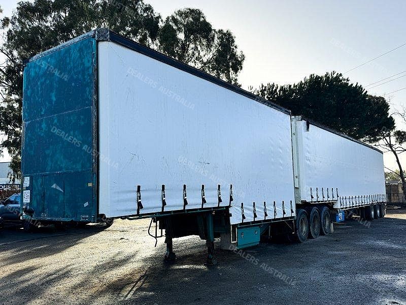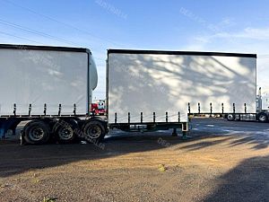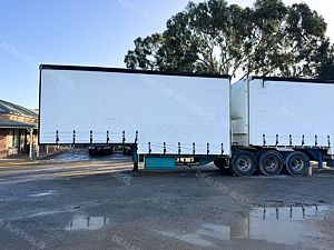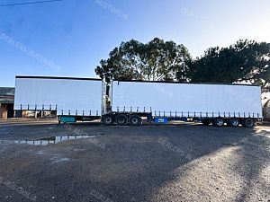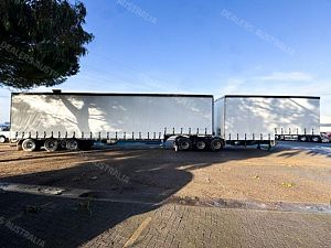 Well-presented B-Double double drop curtainsider set with mezz decks, toolboxes, and nose cone. Ready for high-capacity freight operations.