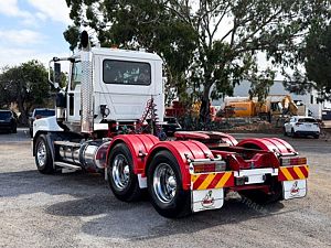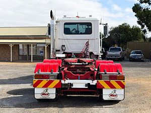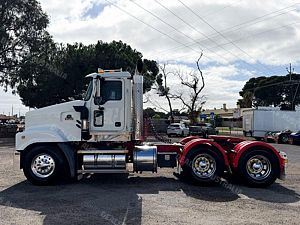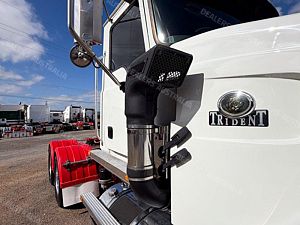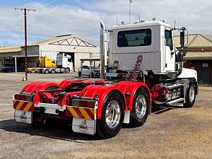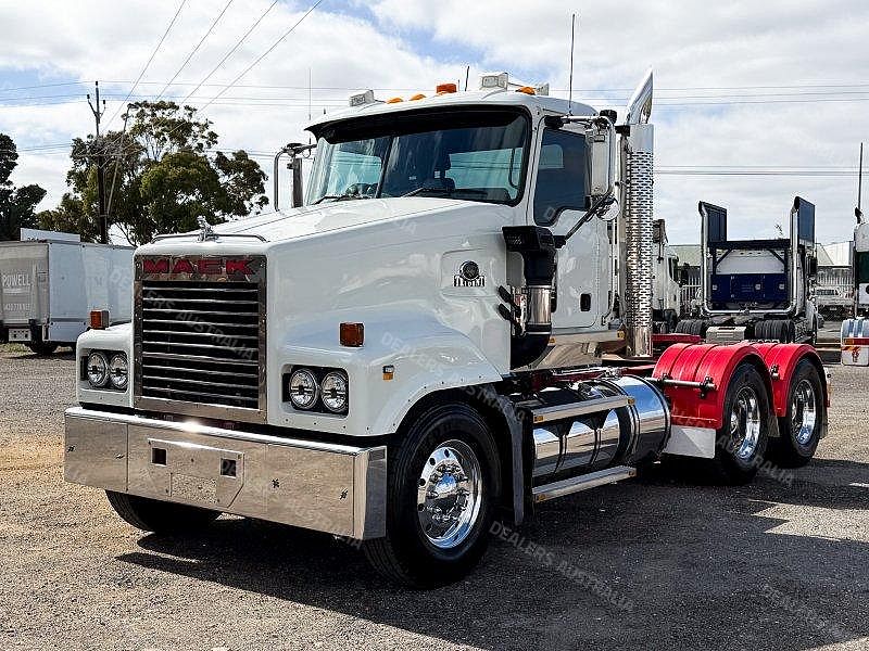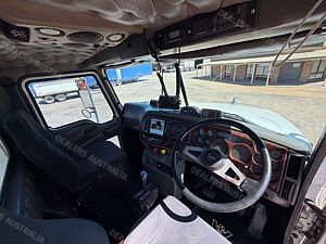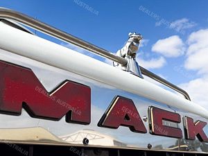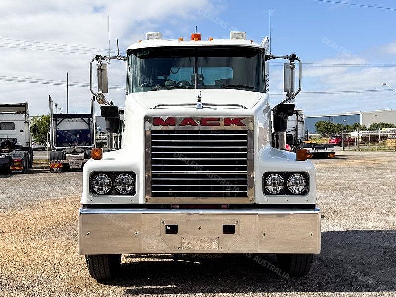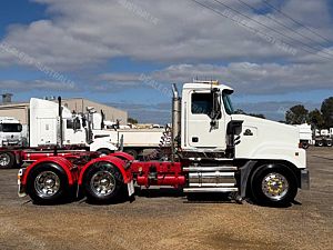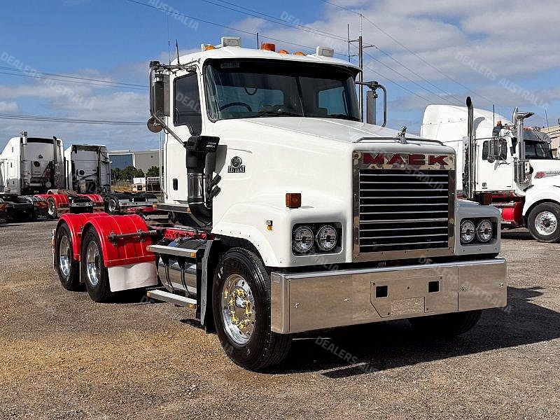2006 Mack Trident 6x4 Day Cab, Mack EA7 @ 470HP, Eaton 18 Speed three pedal Auto, Meritor Drive axles with interaxle and cross lock on Hendrickson Airbag suspension. Polished alloy bumper bar, long vehicle signs, LED headlights, low line air intakes, hook up light, polished round fuel and hydraulic fluid tanks, single stack, chassis walk plates, chassis mounted tool box, tipper hydraulics, red radius guards, JOST fixed greaseless hitch. In cab tipper controls, dash mounted monitor, twin UHF radios, AM/FM Radio with Bluetooth.